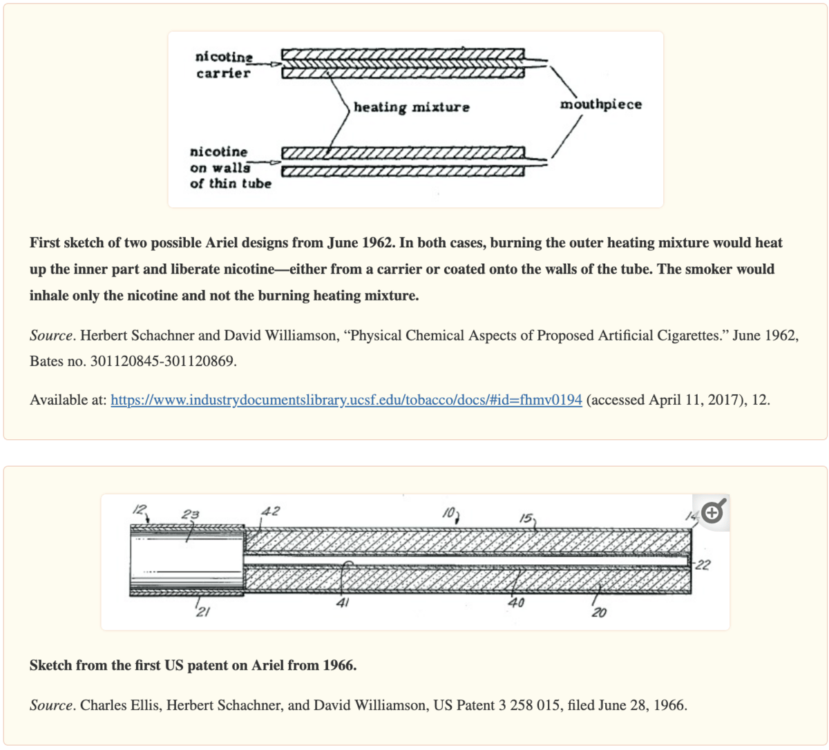 That E-cigarettes were first invented in the 1960s, but were never sold in order to protect the traditional cigarette market. How do we know this. British American Tobacco to develop a novel kind of smoking device under the codename “Ariel” between 1962 and 1967. Whereas filters were meant to eliminate specific harmful constituents of tobacco smoke, Project Ariel tried to reduce smoking to its alkaloid essence: nicotine. By heating instead of burning tobacco, the scientists working on Ariel managed to produce an aerosol smoking device that delivered nicotine with very little tar while retaining the look and feel of a cigarette. However, after receiving two patents for Ariel, British American Tobacco ultimately decided to abandon the project to avoid endangering cigarettes, its main product. Today, as e-cigarettes are surging in popularity, it is worth revisiting Ariel because it is not just an episode in the history of aerosol smoking devices but its starting point. Ever thing that is new, is really some thing is old...