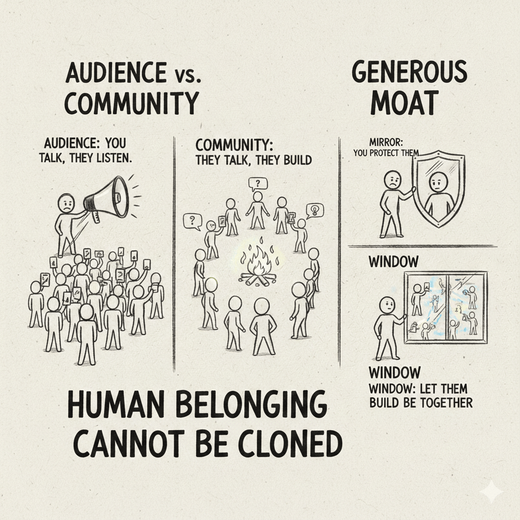 The most common mistake in modern business is confusing an audience with a community. An audience is a group of people facing you, waiting for a broadcast; a community is a group of people facing each other, using your product as the campfire. To build a "Generous Moat," you must pivot from being a Mirror, where you simply reflect and solve your customers' problems to being a Window, where you allow your users to see, help, and build alongside one another. This is the ultimate defensibility because while code and features can be cloned, the shared history, "inside jokes," and peer-to-peer trust of a tribe cannot be automated or bought. In a world of AI generated noise, human belonging is the only asset that doesn't commoditize. If your business vanished tomorrow and the conversations between your users stopped, you didn't have a community, you had a mailing list. The most profound act of "Generosity as a Moat" is letting go of the microphone so your users can finally find their own voice”