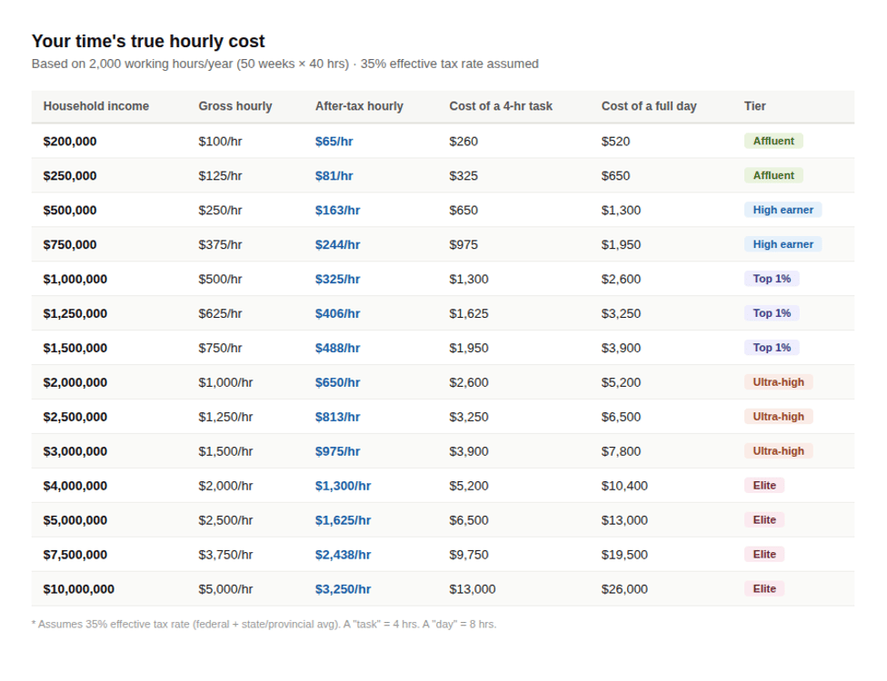 Once someone’s after tax hourly rate clears $300, outsourcing almost anything becomes mathematically rational. The question isn’t “can I afford it?” it’s “why would I ever do it myself?”