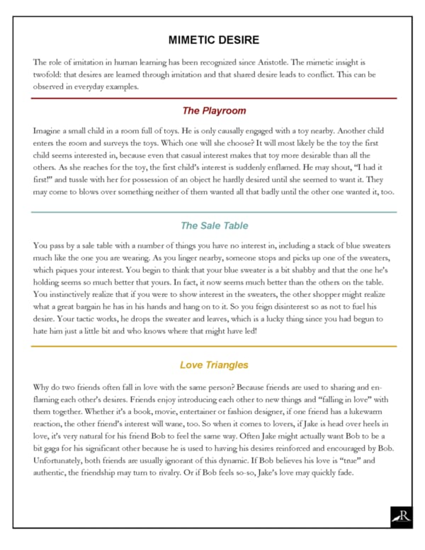Every thing about Memetic desires. The mimetic theory of desire is an explanation of human behaviour and culture which originated with the French historian and polymath René Girard. ... “Man is the creature who does not know what to desire, and he turns to others in order to make up his mind. We desire what others desire because we imitate their desires.” Once you get this, mind blown, you can not look at your life again the same way.