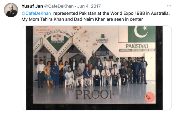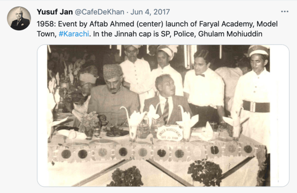 "Two brothers, Haji Ishaq Jan and Haji Amin Jan (my grandfather) were the founders. They were famous in India and participated at the fairs (numaaish) held at Aligarh, Nauchandi, Meeeuth and so on. After migrating to Pakistan they opened Cafe de Khan in 1952 at Nicol Road in Karachi!