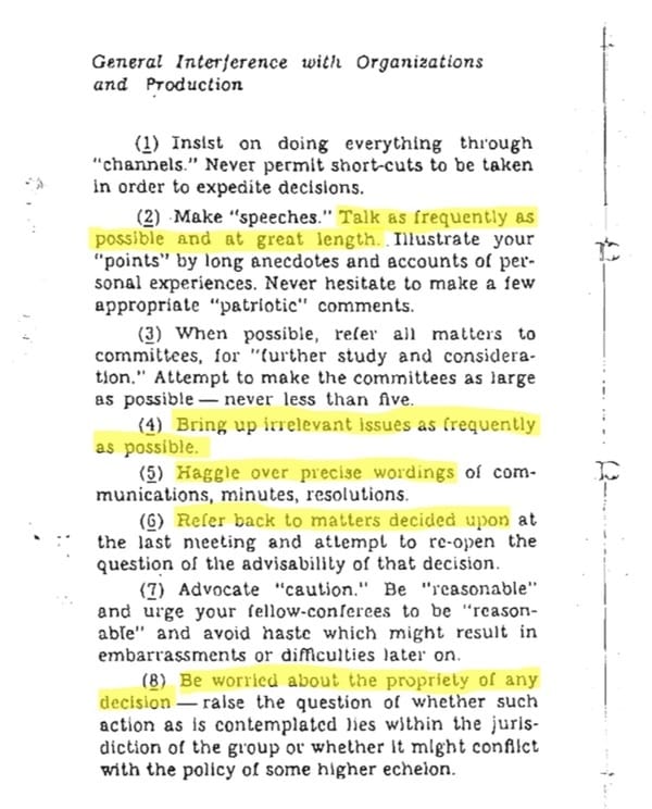 This was the hand book of sabotage, not like the CIAs sabotaging your current work place, but if people exhibit these traits you should know that this company/organization and its people are going down a spiral that doesn't result in successful outcomes.